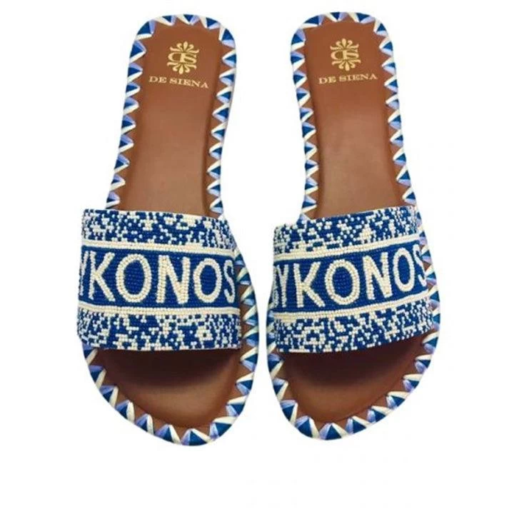 De Siena Mykonos slide made of light brown leather, embellished with beads in shades of blue on the front and tricolor raffia finishes on the insole. Leather sole, heel height 1 cm
