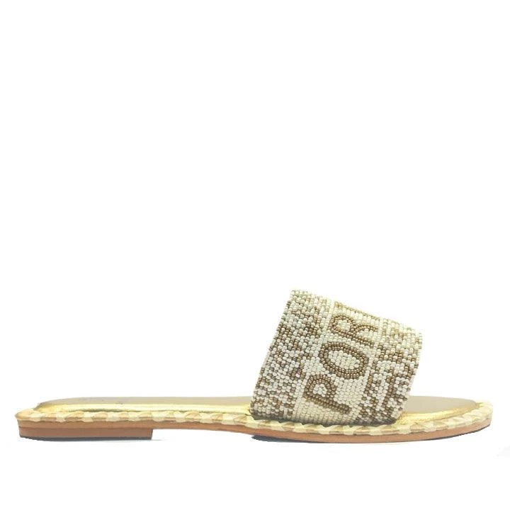 Portofino beaded slides from DE SIENA SHOES featuring indigo Gold, calf leather, bead embellishment, contrasting border, low block heel, branded leather insole, open toe and slip-on style.