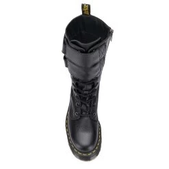 Black Jagger boots from Dr. Martens featuring a pebbled leather texture, a lace fastening, a hook and loop strap fastening, a side zip fastening and a chunky, ridged, rubber sole.