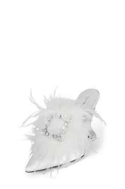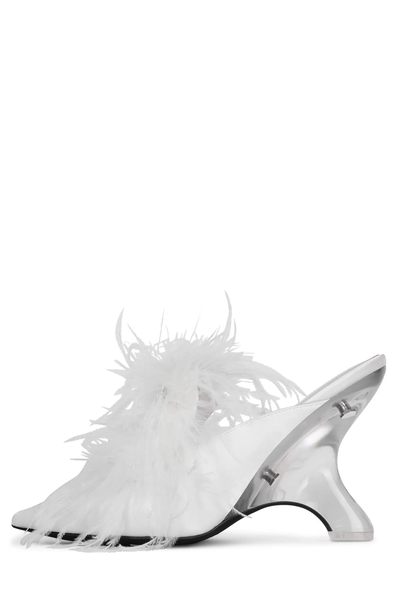Genuine Turkey & Ostrich feather pointed-toe mule with sculpted lucite wedge and jeweled ornament