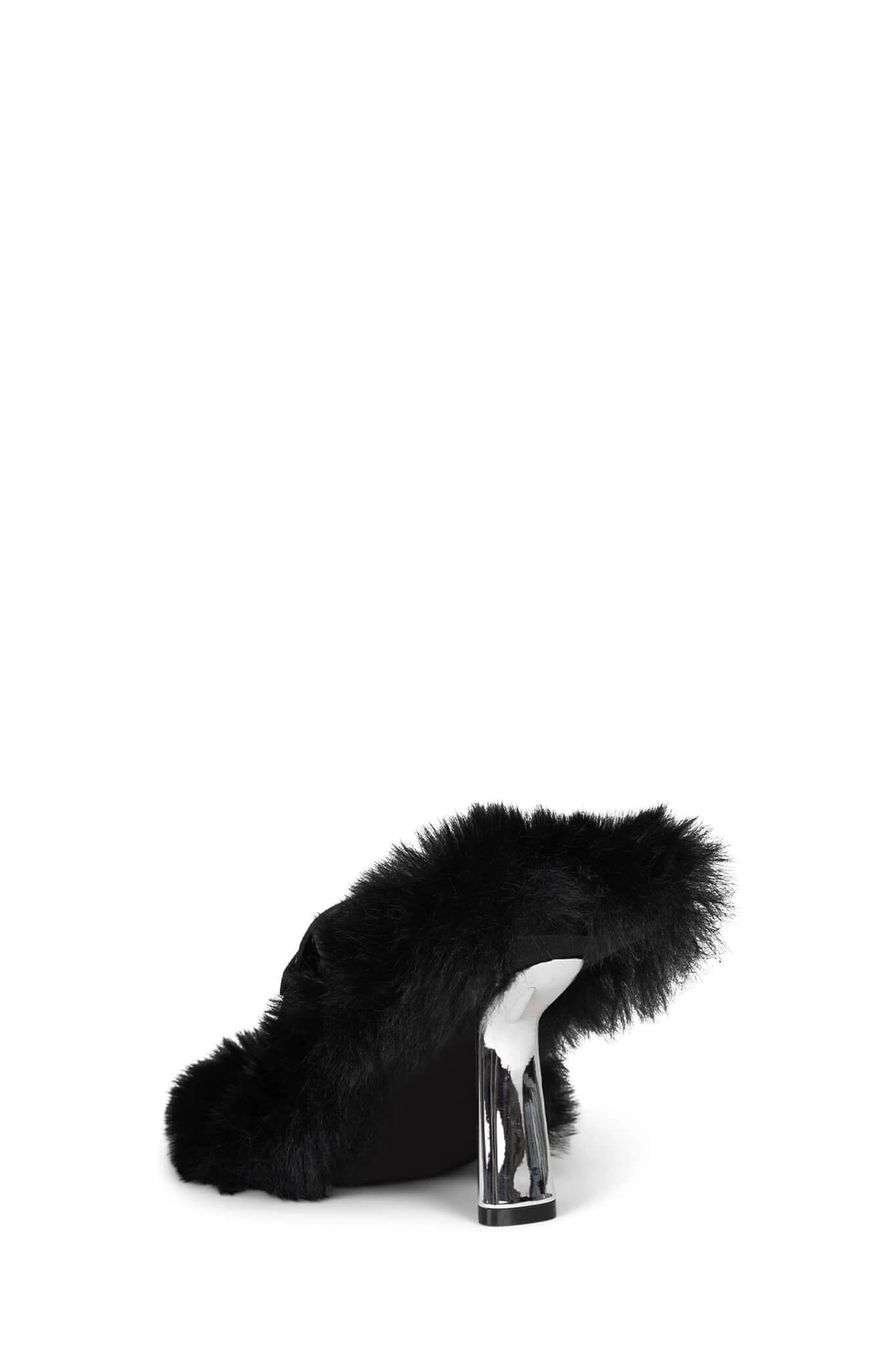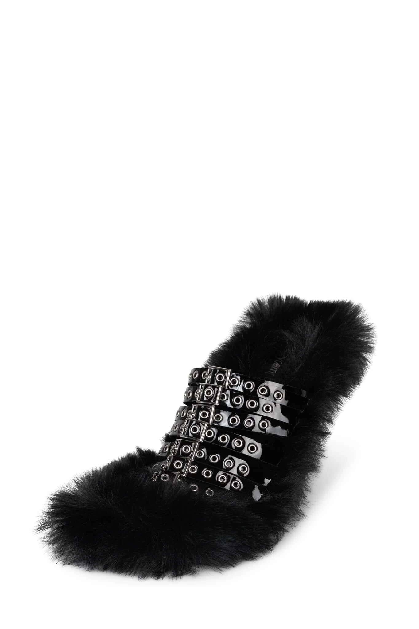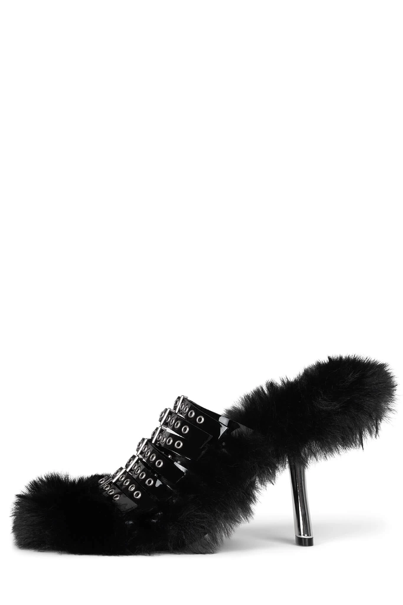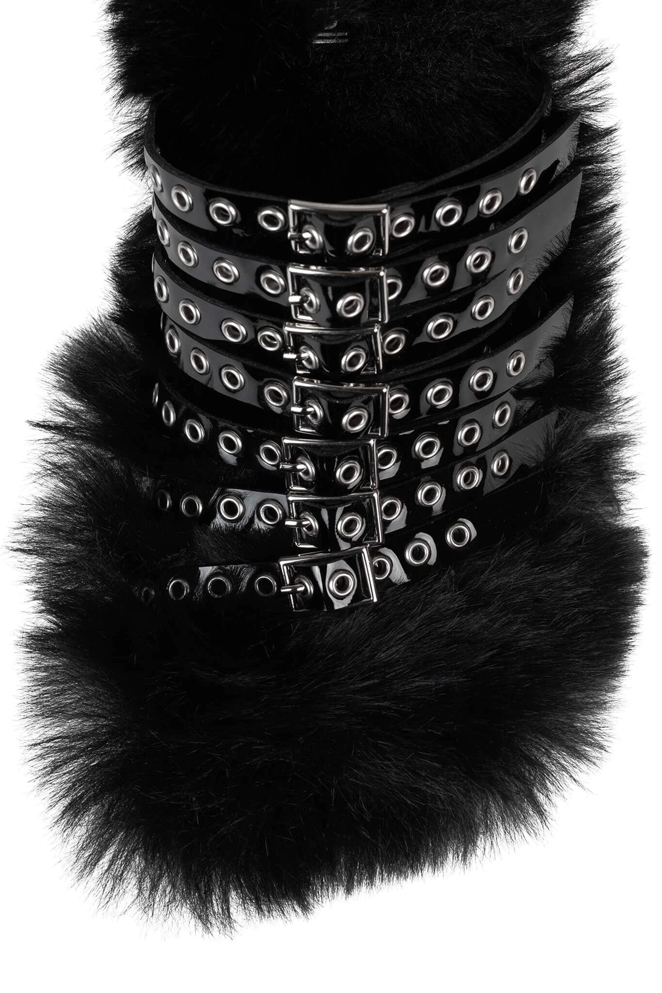Faux-fur sandal with buckled strap detail and sculpted heelÂ