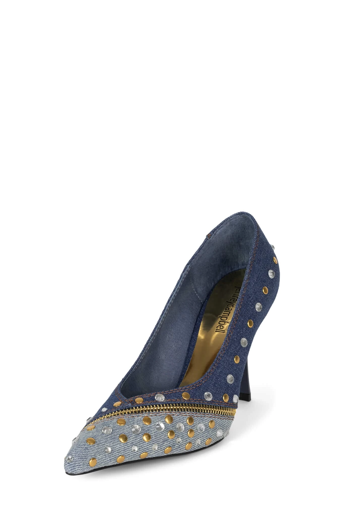 V-cut vamp denim pump with zipper and stud/jewel detail