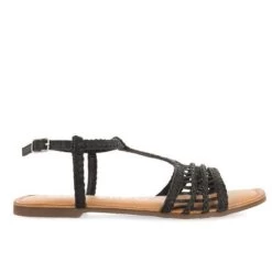 Black open sandals for women Gioseppo brand. The material used in its manufacture is various materials. The heel of this pair of sandals is flat.