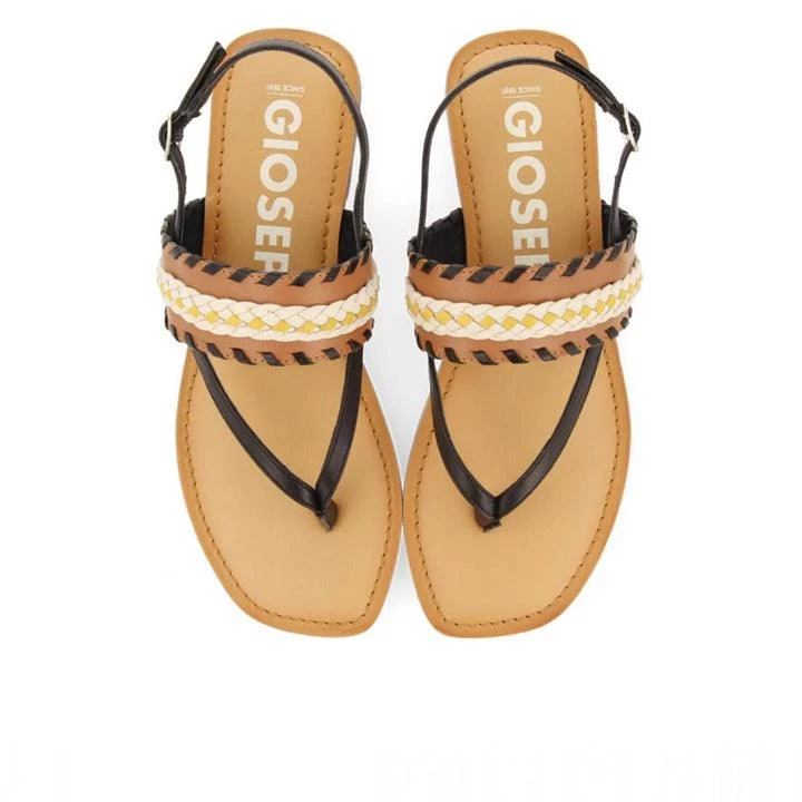 An essential for the whole summer! Black sandals with a wide leather strap across the instep featuring decorative stitching and multicoloured braiding. Adjustable buckle fastening at the ankle to provide extra support. Leather insoles with latex cushioning that guarantees extra comfort. Insoles made of leather produced in tanneries which follow a more sustainable tanning process in line with Leather Working Group standards. Flexible soles.