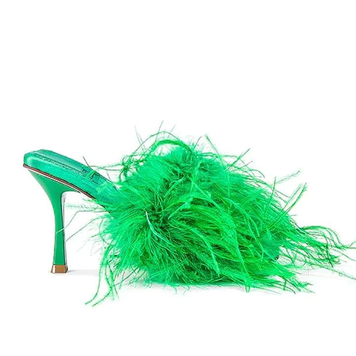 Square toe heeled sandal with genuine Turkey feathers.