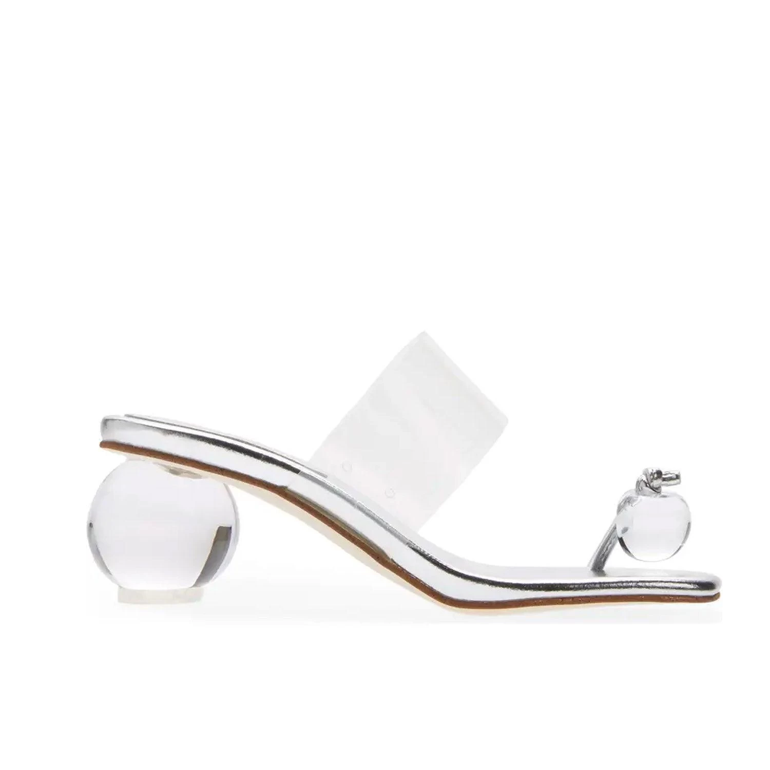 Sandal with lucite spherical heel and matching toe post.
