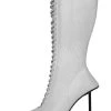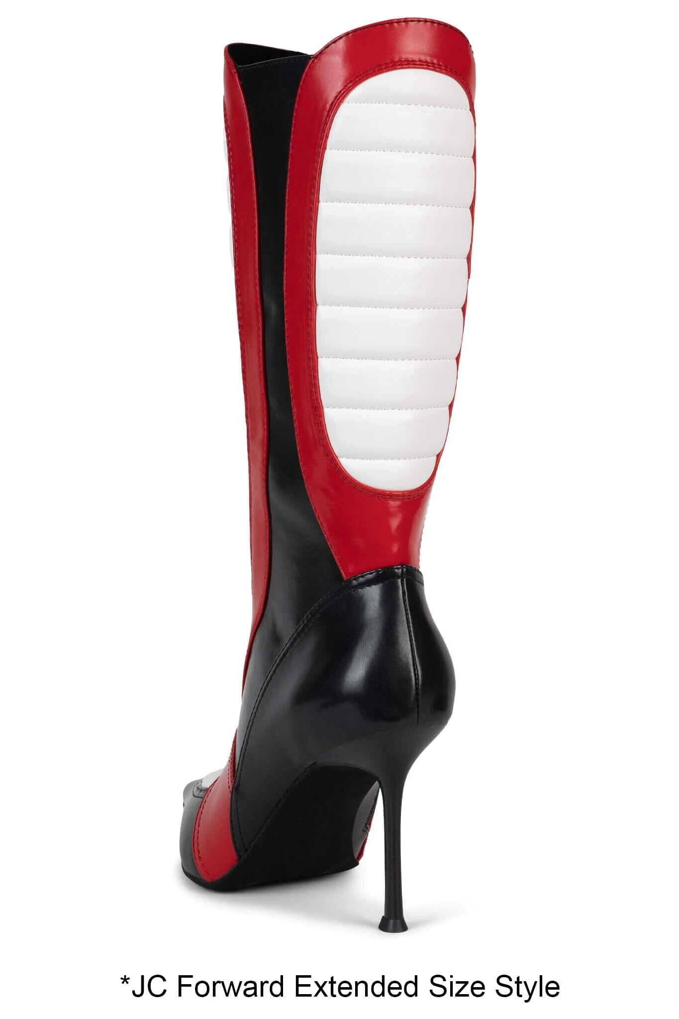 Knee-high moto-inspired stiletto boot, now offered in extended sizing