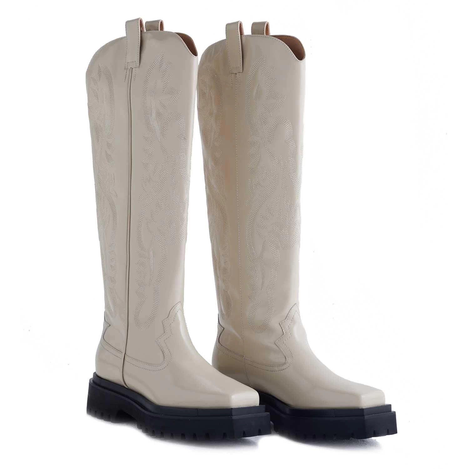 A sharp square toe and embroidered shaft give a nod to Western style in this lug-sole boot featuring a knee-high silhouette.