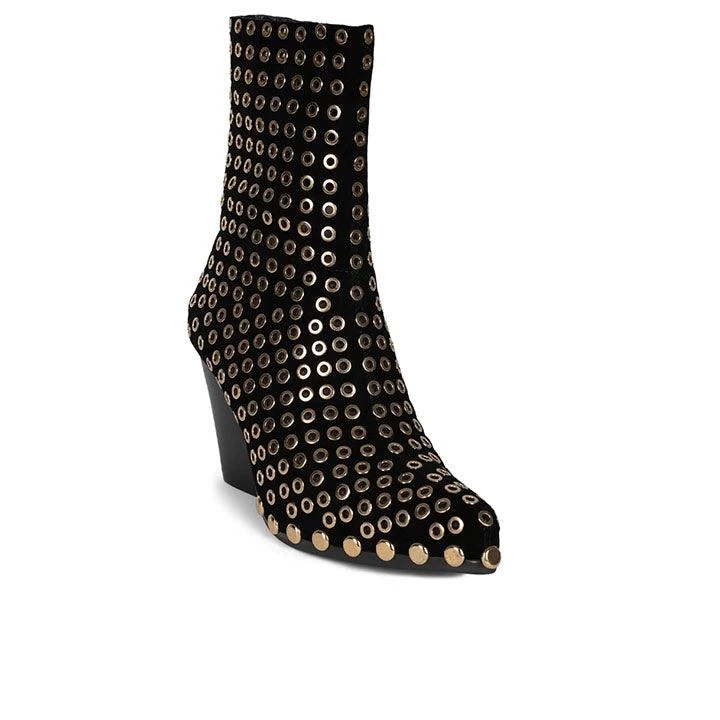 Western-inspired ankle bootie with studded welt and metal leather detail