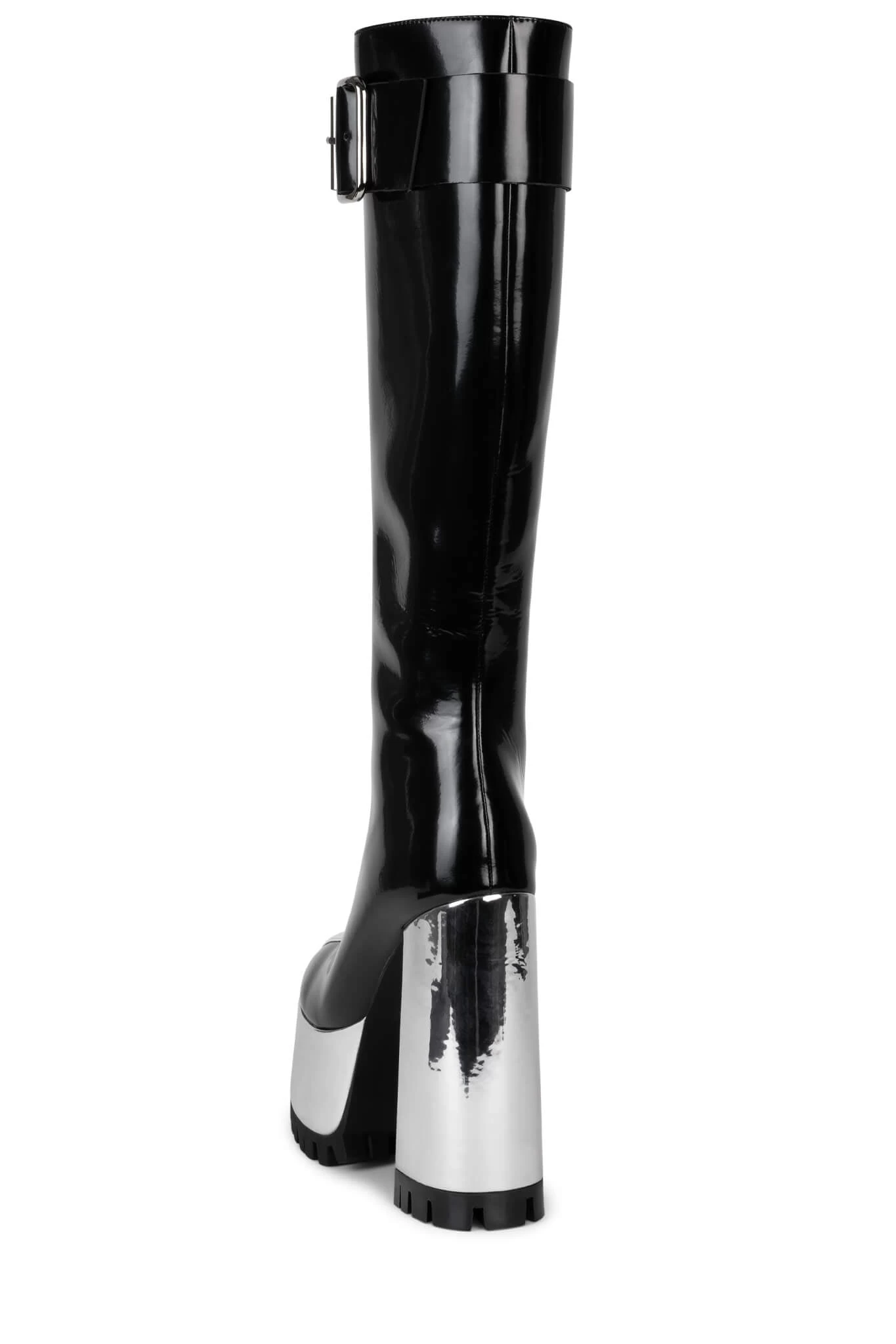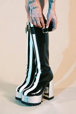 Knee-high boot with buckle detail and metallic platformÂ